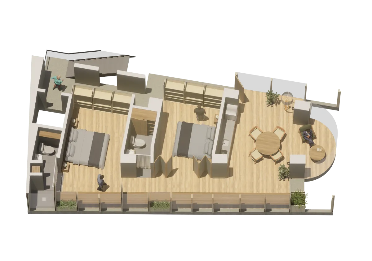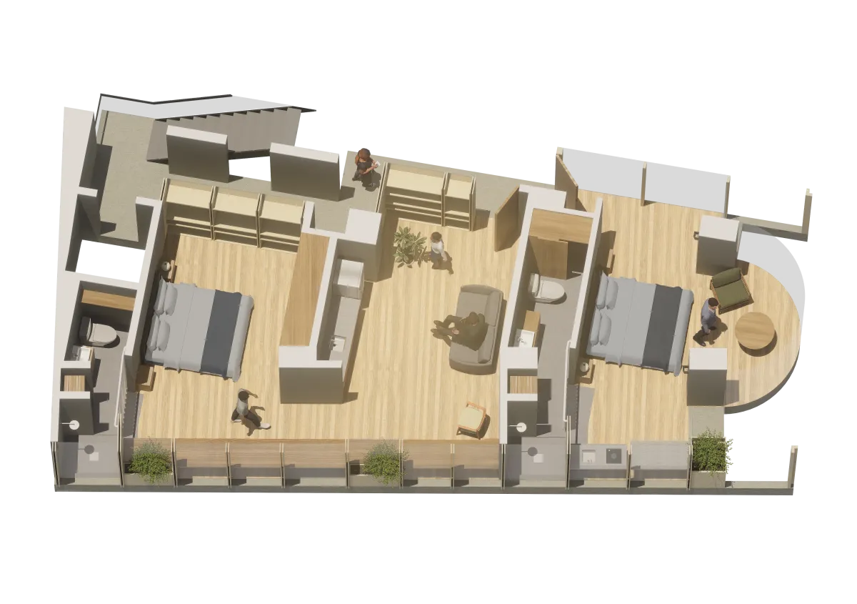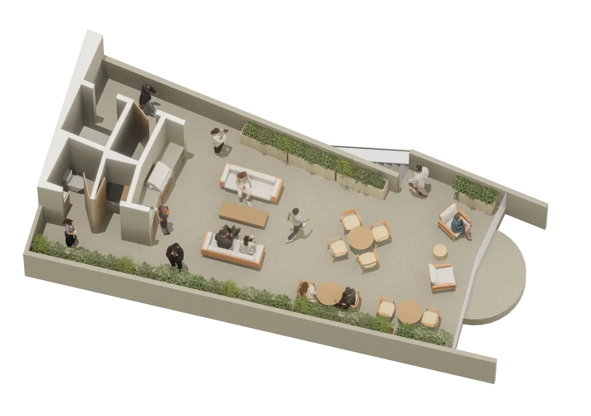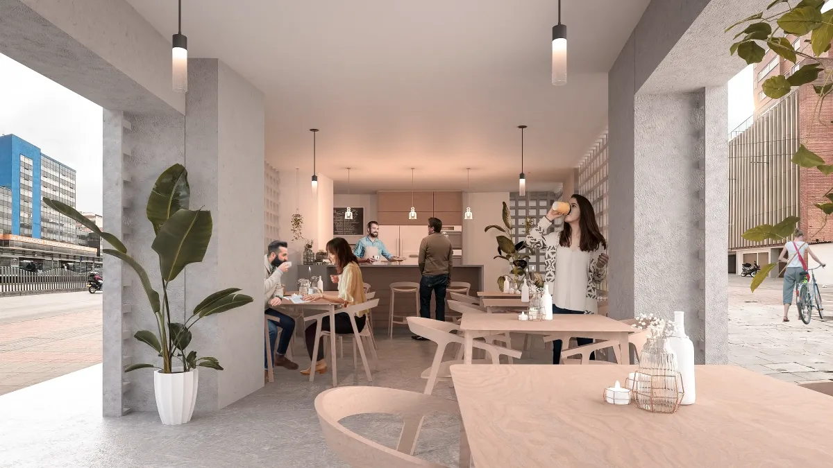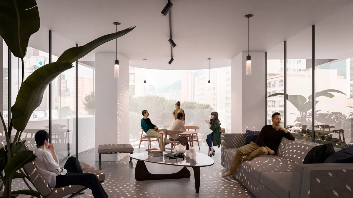 Áreas Comunes Complementarias: Espacios que elevan la experiencia del huésped, como cocina social, taller de artes, lavandería y una terraza con zona BBQ y las mejores vistas a los cerros y la ciudad.